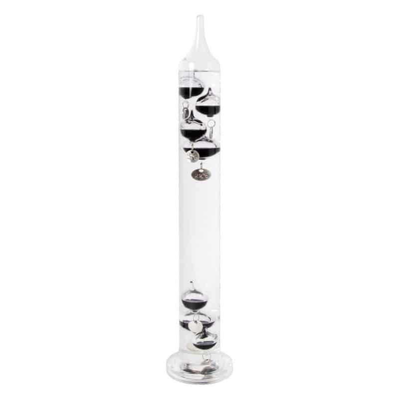 Housed in this cylindrical Galileo thermometer are 7 black balls that gracefully ascend and descend as temperatures fluctuate. It’s a stylish and fascinating addition to any living or working area that prompts admiration for the science and precision involved in these beautifully moving black balls.