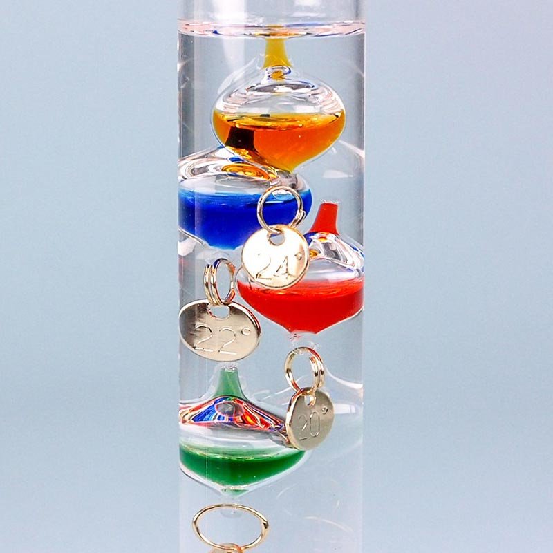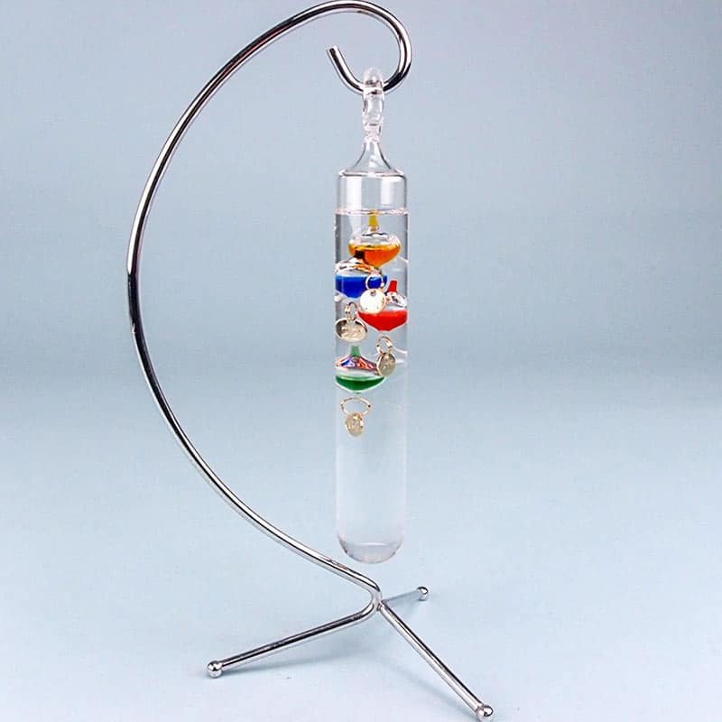 Experience the craftsmanship of a temperature-measuring tool that has its roots in the 17th century. A Hanging Galileo Thermometer artfully displayed from a stylish metal arch, enhancing the charm of the four balls inside the liquid tube. As the temperature shifts, become fascinated by the rising or falling of the vibrantly colored balls.