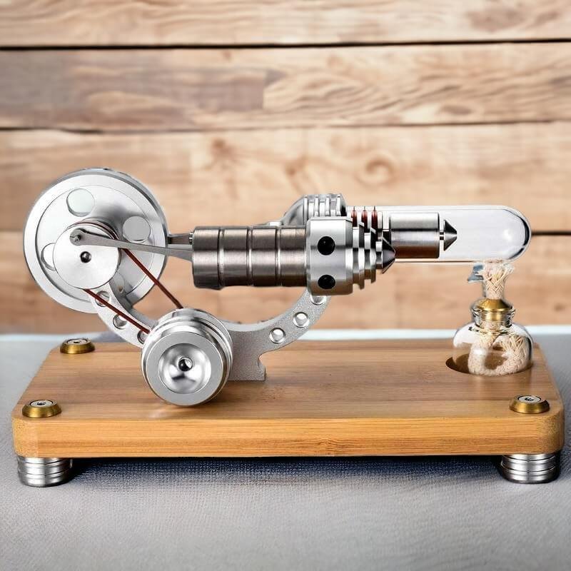More than a miniature, this warm air Stirling device is a fully practical model tool. Need to complement your scientific-theme household decor? Utilise the seamless aesthetics of the wooden base and robust glass and metal motor to stylishly exhibit the Stirling cycle’s principle!