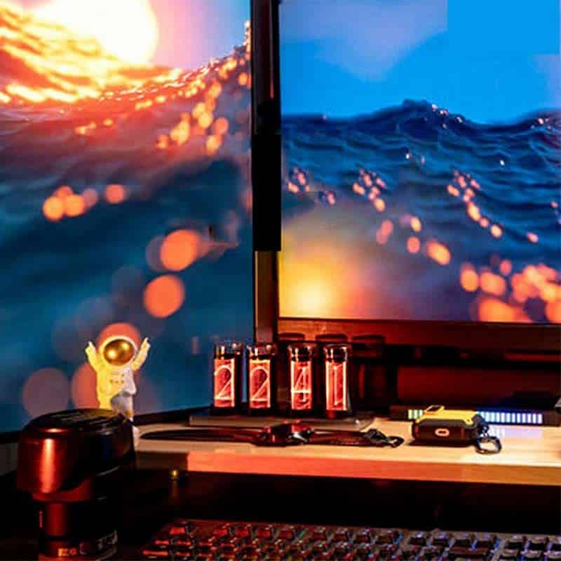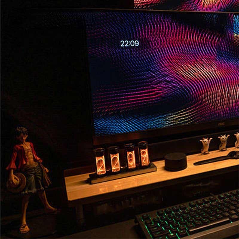 This clock, with only four tubes, showcases the time in hours and minutes. See the transfiguration of hours by adjusting the hues as you prefer. From azure to crimson, lavender to tangerine, personalize your diminutive Nixie clock to complement your domicile decor perfectly.