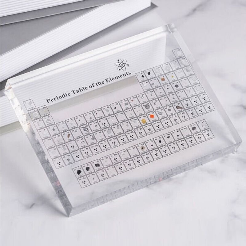 Our real periodic table of elements is distinguished by the incorporation of 83 actual element samples encased within the clear resin. This design not only allows an actual visualization of the elements but also leads to their more exciting and direct examination. Gaseous and radioactive elements are intentionally omitted for safety reasons, yet the majority of the solid elements are included, providing an educational and unique study platform. The realistic display of these elements significantly upgrades our periodic table, deeming it a crucial decor piece for avid science learners.