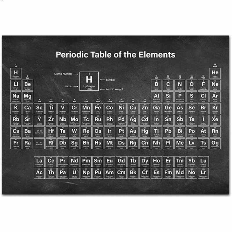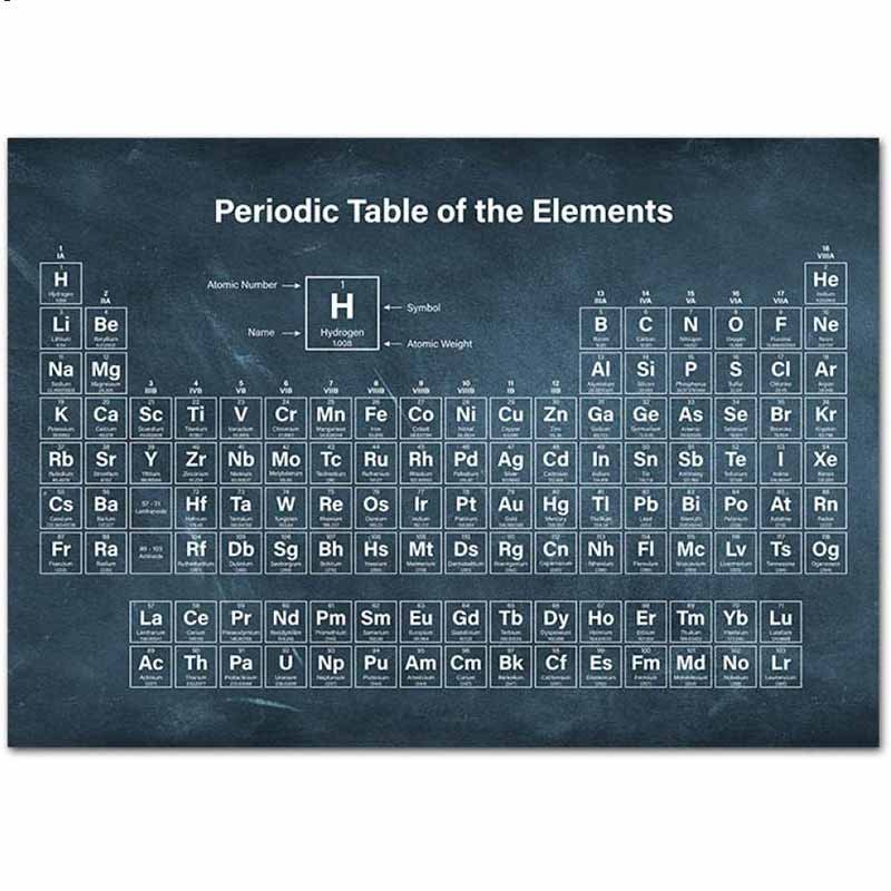 Positioning this poster in a room gives an impression of a classroom or laboratory setting. The distinct contrast between the white text and a dark backdrop evokes the image of chalk writing on a slate board. Its visually pleasing effect makes this Mendeleïev’s Periodic Table Poster an ideal addition for light-toned interiors.