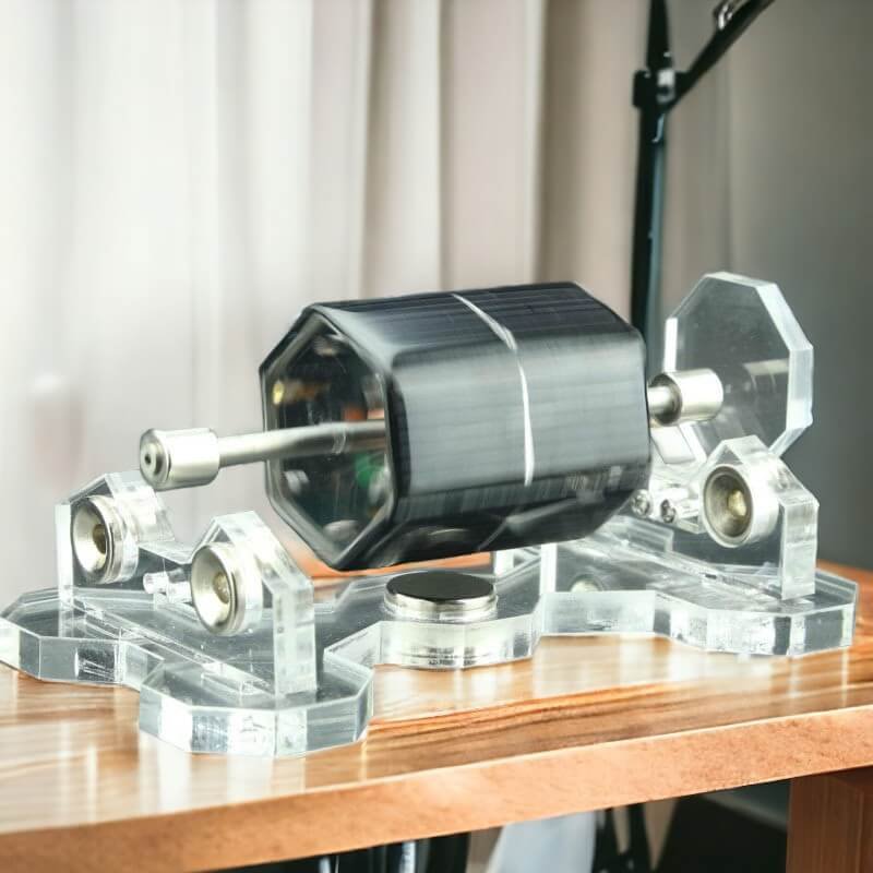 The floating solar Stirling engine features a clear base under an octagonal rotor secured by a central beam. This is possible through a series of magnetic coils within the rotor and magnets meticulously positioned on the base and beam ends. Driven by Lorentz force, this unique Stirling engine uses sunlight and light-related friction to spin the rotor.