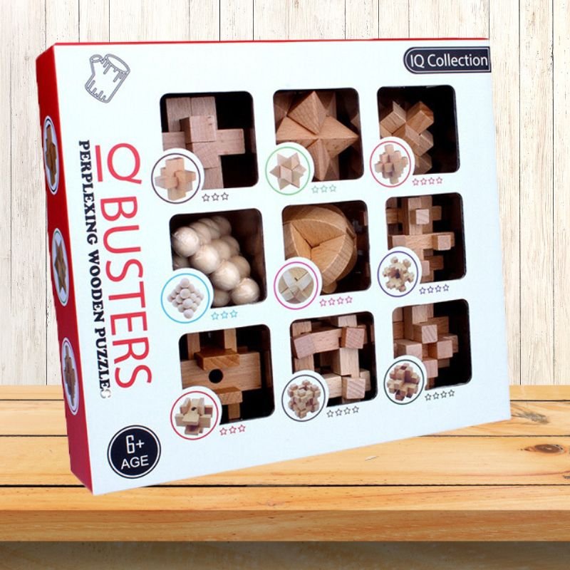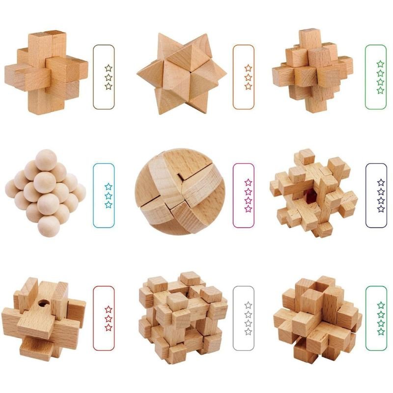 Explore the joy of critical thinking with our 9-Piece Wooden Brain Teaser Puzzles. Each puzzle within this set brings a diverse challenge, crafted to engage your wit and deliver unlimited pleasure. Imagine the thrill of decoding these intricate puzzles. This transcends regular gaming, offering you an invigorating mental expedition, inviting you to challenge your analytical abilities and dive into the thrilling sphere of rationalization and reason.